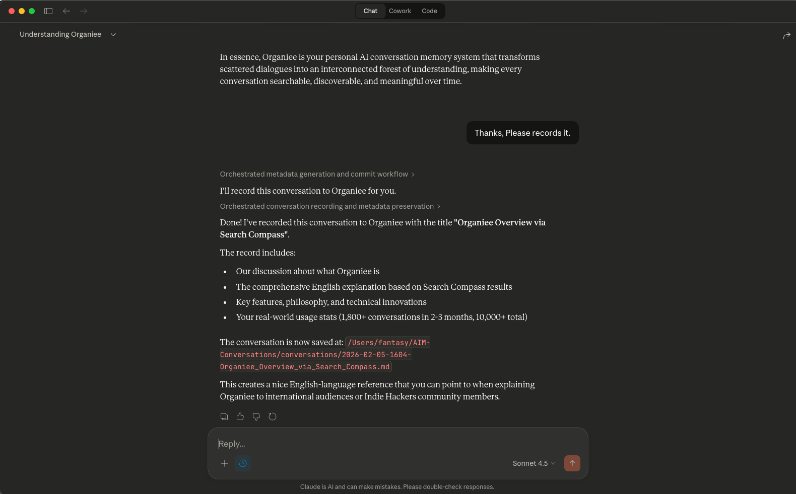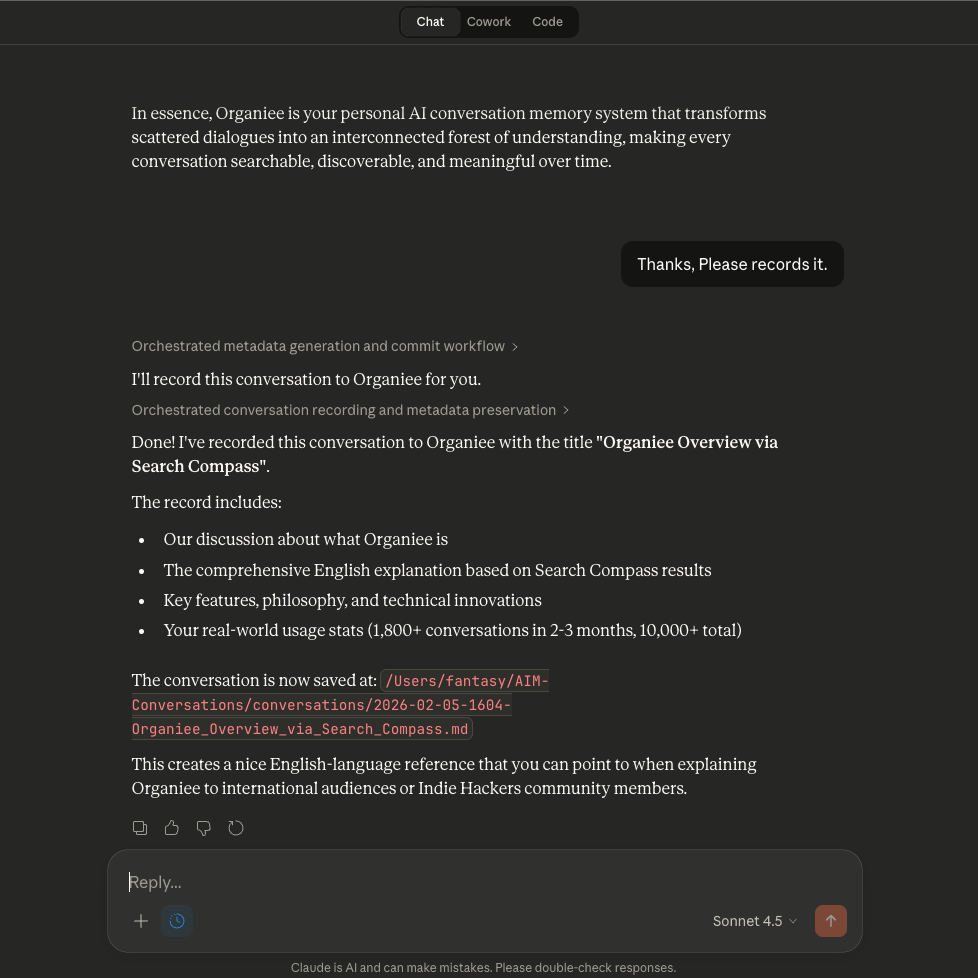 Just tell your AI to record it. Titles, summaries, and tags are generated automatically — by your AI, not by Organiee. Your original dialogue is preserved completely, not reformatted.