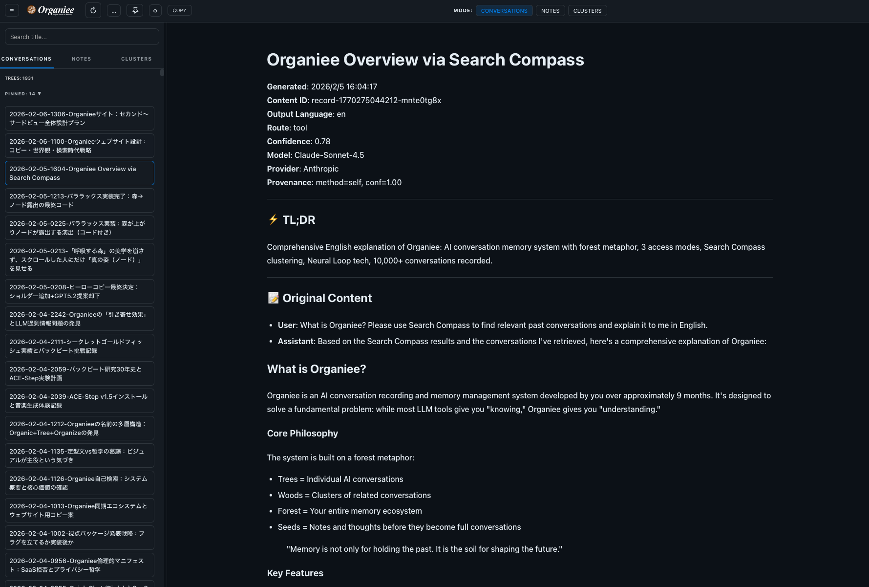 Browse your entire memory forest. Every conversation is structured with auto-generated titles, TL;DRs, and tags — with your original dialogue preserved underneath.