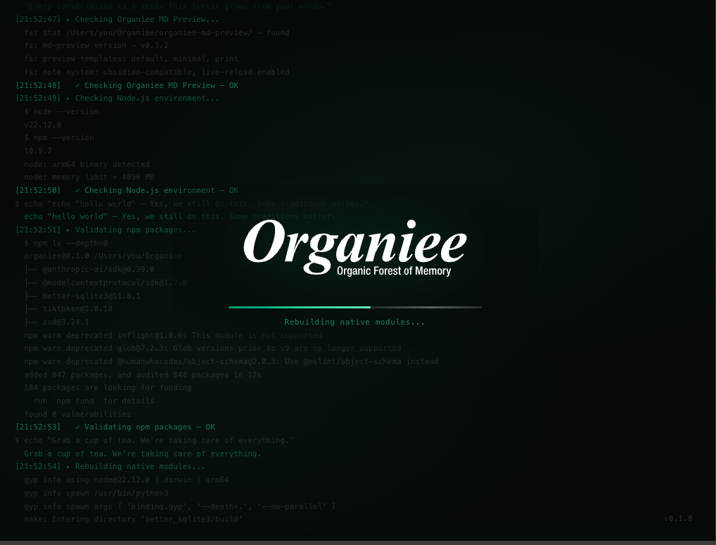100% locally on your machine. Organiee saves your conversations as standard Markdown files. No cloud, no lock-in. Your forest belongs to you.