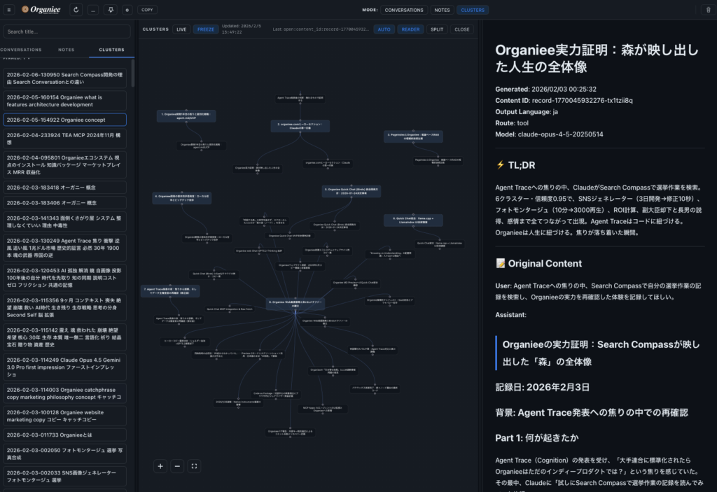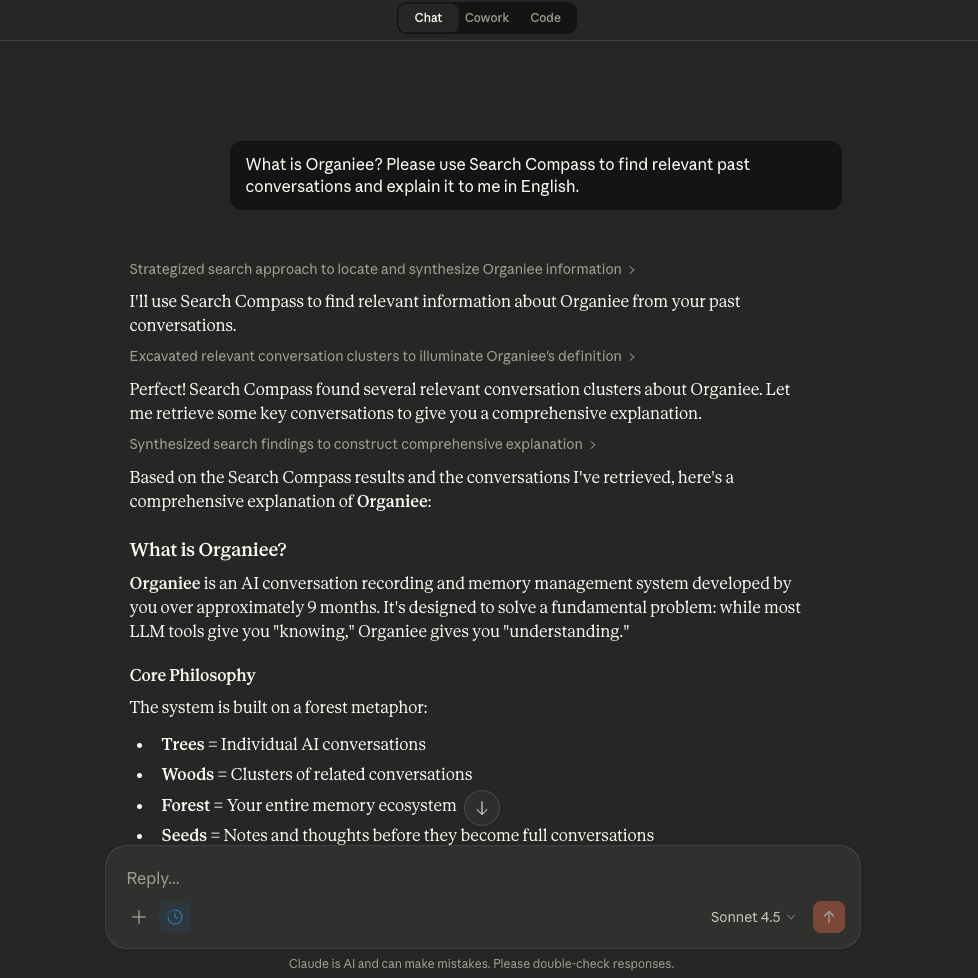 Ask questions about your past conversations — Organiee searches across your entire memory forest. Search Compass goes further: it clusters related conversations in real time, revealing connections you never made yourself.